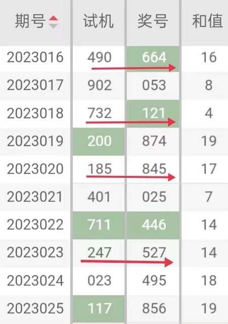 ①试机号:通过查询以往历史近100期开奖记录中,发现大部份开奖结果里开奖号码都能与当期试机号发生重复一枚的特征。根据这一高概率的重复特征现象,即本期需要继续关注考虑试机号作为选号的参考。